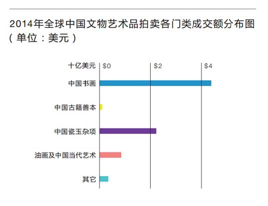 — 中国书画仍然是全球中国文物艺术品拍卖第一大板块,占总成交额的55%。该板块在中国大陆市场排名第一,在海外市场排名第二,是仅有的两个较2013年成交额有所增长的板块之一。中国书画自2011年以来在海外市场所占份额不断增长,逐渐侵蚀海外第一大板块中国瓷玉杂项的市场份额。  — 在中国大陆,仅油画及中国当代艺术和中国书画这两个板块的平均价格高于区域均价。油画及中国当代艺术在中端价格市场表现强劲,而中国书画获得高平均价格的主要支撑点来自高端价格市场。 — 中国文物艺术品在海外的平均成交价(4.9万美元/31.8万元人民币)显著高于大陆地区(1.7万美元/10.9万元人民币)。价位差异主要体现在油画及中国当代艺术板块。该板块在大陆地区平均成交价格为3.5万美元(21.8万元人民币),而在海外地区则达到15.3万美元 (98.3万元人民币)。 欲获取《中国文物艺术品全球拍卖统计年报2014》完整版,请登陆中国拍卖行业协会官方网站下载,或发邮件至jinsheng@caa123.org.cn索取纸质版。 中拍协对中国大陆地区拍卖市场具有较为系统、科学和详尽的统计,其部分重要统计项目暂未能与海外对接合并,欲知中国大陆地区拍卖市场年度内的“结算进度”、“实收拍品款”、“实收佣金”、“实收佣金比例”、“主营业务利润”、“纳税”、“劳动效率”、“产业链贡献”、“千万元拍品结算情况”等实际经营情况,及主要拍卖企业在各项经营指标中的排名情况等,请参阅由中国三家政府权威部门联合中国拍卖行业协会每年度发布的《中国文物艺术品拍卖市场统计年报》。 关于中拍协CAA