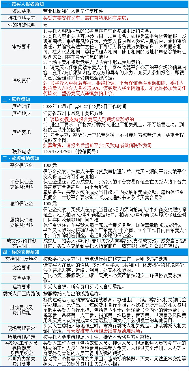 有意竞买者需开通中国兵器工业集团采购电子商务平台帐号进行报名及缴纳线上保证金。所竞价标的:2024年1-2月废纸皮,起拍价980元/吨,预估重量10吨,标的质量及重量均以现场预展实物实际过磅为准,所提供标的简介、图片仅供参考,委托方及我公司均不承担瑕疵担保责任。