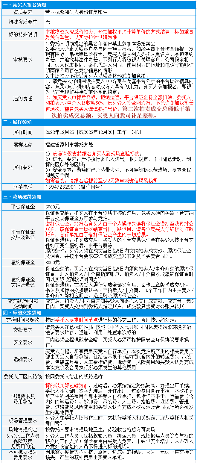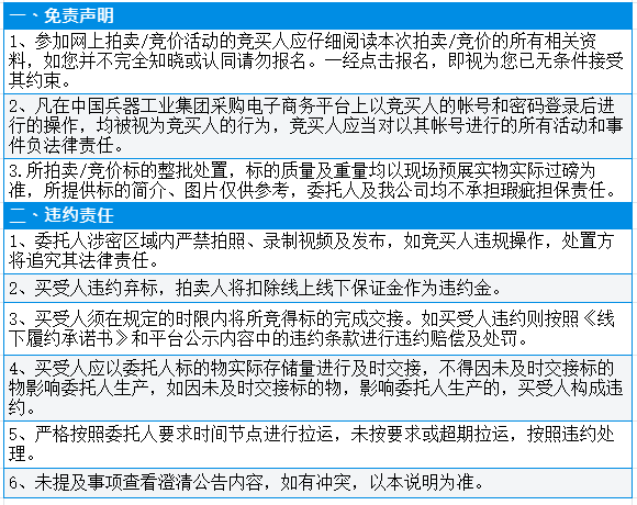 有意竞买者需开通中国兵器工业集团采购电子商务平台帐号进行报名及缴纳线上保证金。所竞价标的:废钢、废不锈钢(含杂),起拍单价23490元/批(有保留价),预估数量1批。