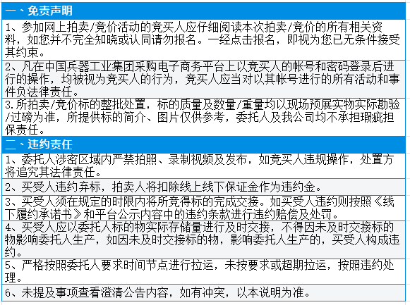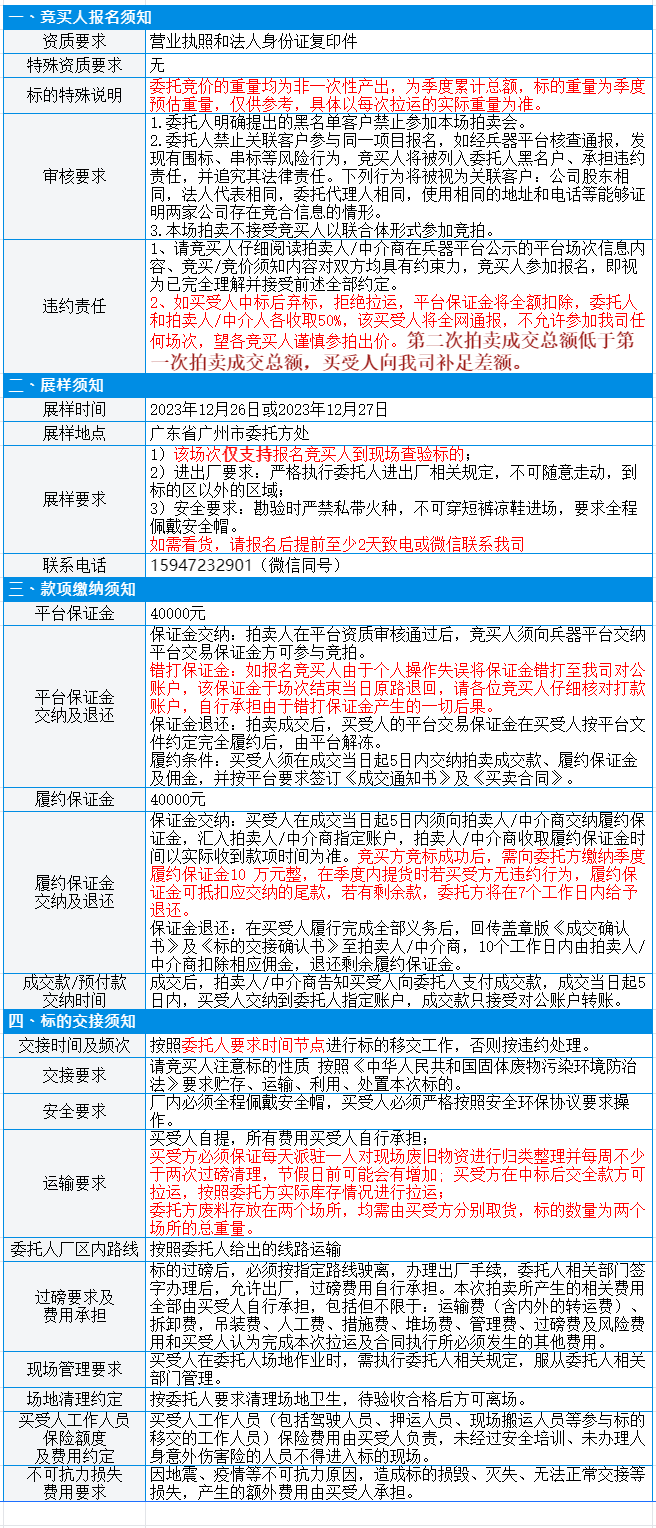 有意竞买者需开通中国兵器工业集团采购电子商务平台帐号进行报名及缴纳线上保证金。所竞价标的:24年第一季度废旧物资,起拍价374777.6元/批,数量为1批整包处置,标的质量及重量均以现场预展实物实际过磅为准,所提供标的简介、图片仅供参考。