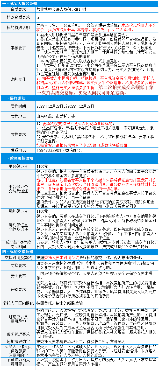 有意竞买者需开通中国兵器工业集团采购电子商务平台帐号进行报名及缴纳线上保证金。所竞价标的:废旧生产试验设备(共两台),起拍单价:10661.00元/批,预估数量:1批,标的质量及数量均以现场预展实物实际勘验为准,所提供标的简介、图片仅供参考