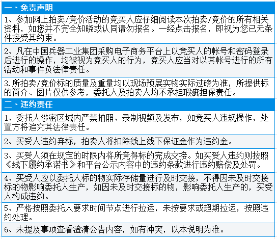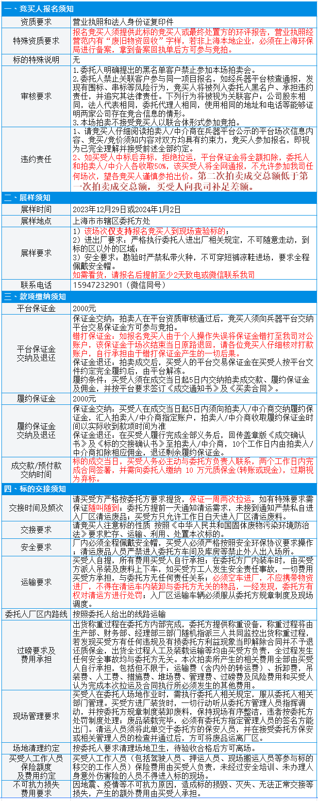 有意竞买者需开通中国兵器工业集团采购电子商务平台帐号进行报名及缴纳线上保证金。所竞价标的:废铜废料,41000元/吨,预估重量0.4吨。特别提示:报名竞买人须提供此标的竞买人或最终处置方的环评报告,营业执照经营范内有“废旧物资回收”字样,若非上海本地企业,必须在上海环保局进行备案,拿到备案回执单后方可参与竞拍。