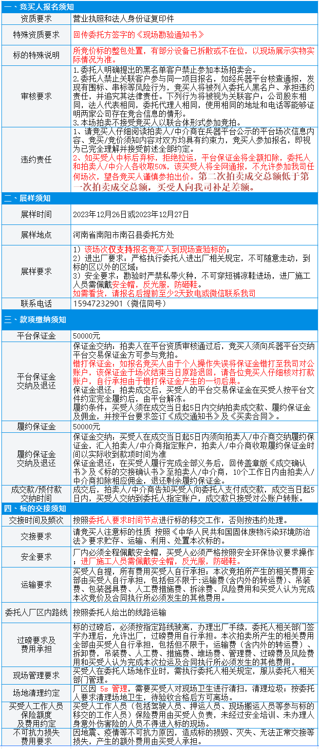 有意竞买者需开通中国兵器工业集团采购电子商务平台帐号进行报名及缴纳线上保证金。所竞价标的:废旧设备,起拍价:367180元/批,预估数量1批。标的质量与数量均以现场预展实物实际勘验为准,所提供标的简介、图片仅供参考。
