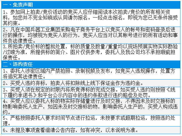 有意竞买者需开通中国兵器工业集团采购电子商务平台帐号进行报名及缴纳线上保证金。所竞价标的:废旧物资一批,起拍单价14500元/批,整包处置,标的质量及重量均以现场预展实物实际过磅为准,所提供标的简介、图片仅供参考,委托方及我公司均不承担瑕疵担保责任。