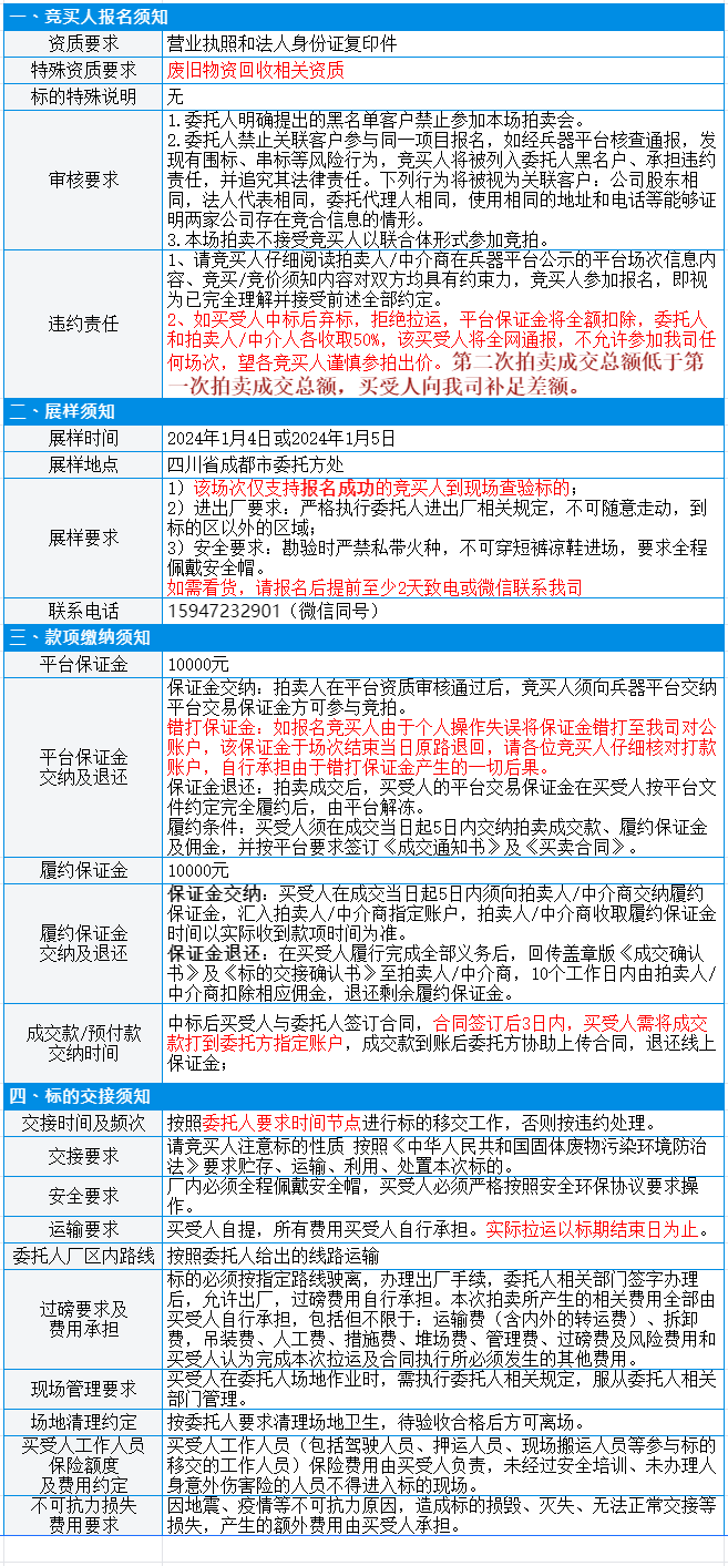 有意竞买者需开通中国兵器工业集团采购电子商务平台帐号进行报名及缴纳线上保证金。所竞价标的:一批废旧设备,起拍单价88000元/批,数量为一批。