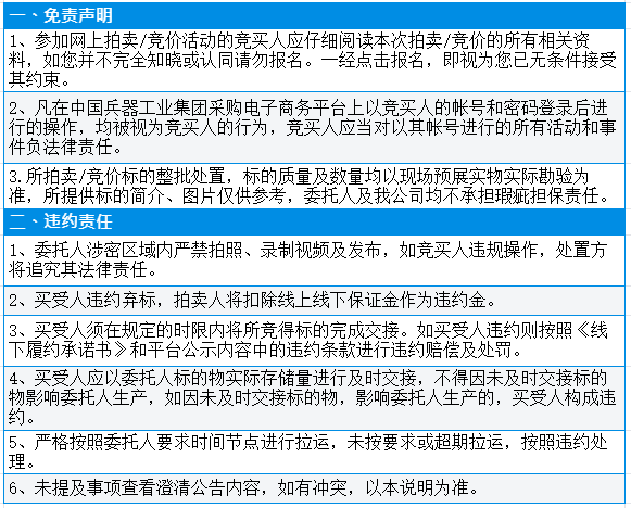 有意竞买者需开通中国兵器工业集团采购电子商务平台帐号进行报名及缴纳线上保证金。所竞价标的:废旧生产试验设备(共两台),起拍单价:9595元/批,预估数量:1批,标的质量及数量均以现场预展实物实际勘验为准,所提供标的简介、图片仅供参考.