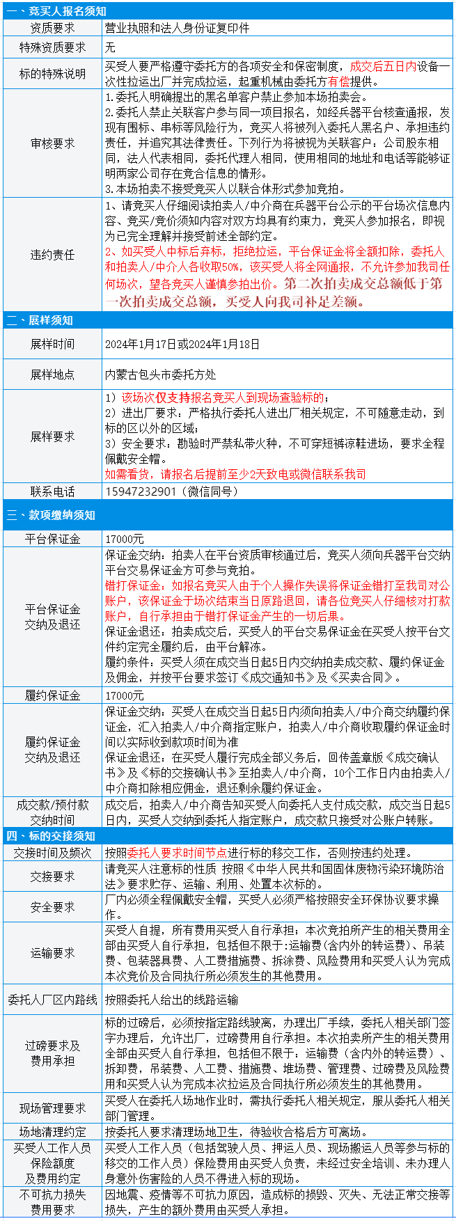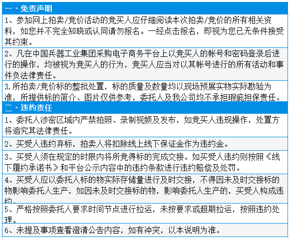 有意竞买者需开通中国兵器工业集团采购电子商务平台帐号进行报名及缴纳线上保证金。所竞价标的:废旧设备一批,起拍价:132808元/批,整包处置,标的质量与数量均以现场预展实物实际勘验为准,所提供标的简介、图片仅供参考。