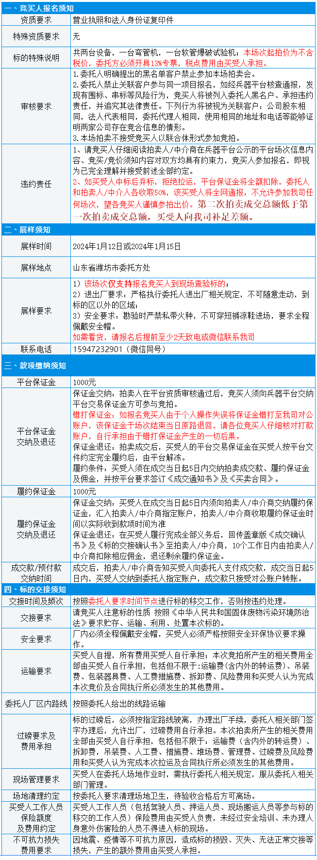 有意竞买者需开通中国兵器工业集团采购电子商务平台帐号进行报名及缴纳线上保证金。所竞价标的:废旧生产试验设备(共两台),起拍单价:8635.5元/批,预估数量:1批,标的质量及数量均以现场预展实物实际勘验为准,所提供标的简介、图片仅供参考。