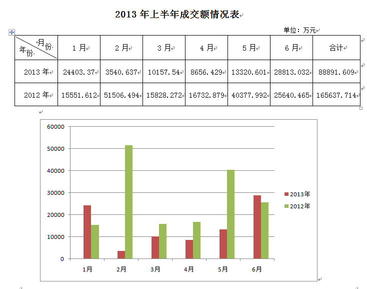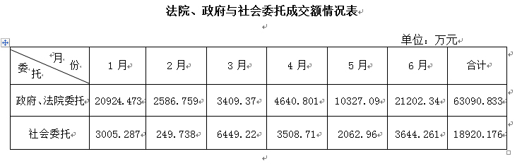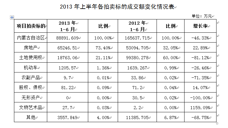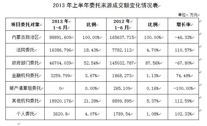 | 一、 上半年业务成交情况 从2013年上半年的统计分析情况看,1月和6月呈现上升趋势,其它四个月呈现下降趋势,总体成交情况呈现下降,下降比例达到46.33%,行业整体形势不乐观。  二、行业经营特点 1、业务板块情况 从统计分析情况看,降幅明显的有土地使用权、机动车、农副产品、无形资产和其它。呈现增长的有房地产、股权、债权,但是增幅不大。文物艺术品增长幅度较大,但由于基数太低,没有代表性。