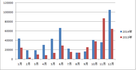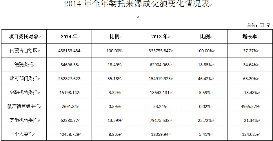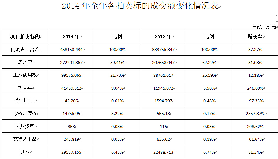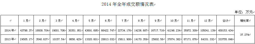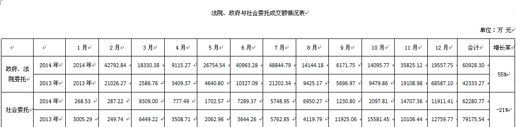 | 一、2014年全区拍卖行业经营总体情况 根据全区2014年全年经营统计数据分析结果如下: 2014年全区共有拍卖企业147家,比2013年增加了11家。拍卖师180名,比2013年增加了12名。 1、 行业经营情况总体呈现上升的趋势,2014年同2013年的增长37%。2014年全年拍卖成交场次889场,较2013年698场增加了27.36%;流拍场次880场,较2013年707场增加了24.46%;成交总额458153.434万元,较2013年成交总额333755.846万元增加了37.27%;拍卖佣金4625.919万元,较2013年4711.567减少了1.8%;营业税金291.258万元,较2013年286.573万元增加了1.6%。 2、 2014年成交额除9月份略有下降外其他月份都呈现增长趋势,成交额较2013年增加了37%,但佣金较2013年减少了1.8%;营业税仅增加了1.6%。由于流拍场次大幅增加,造成企业成本加大,效益下降。拍卖公司一年忙忙碌碌,但是效益很低。