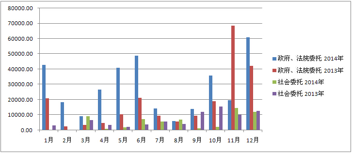 2、 从市场化水平看,政府、法院2014年与2013年相比,增幅明显,达到55%。社会委托下降21%,说明市场化水平提高还是比较艰难,今后的工作任务依然艰巨。