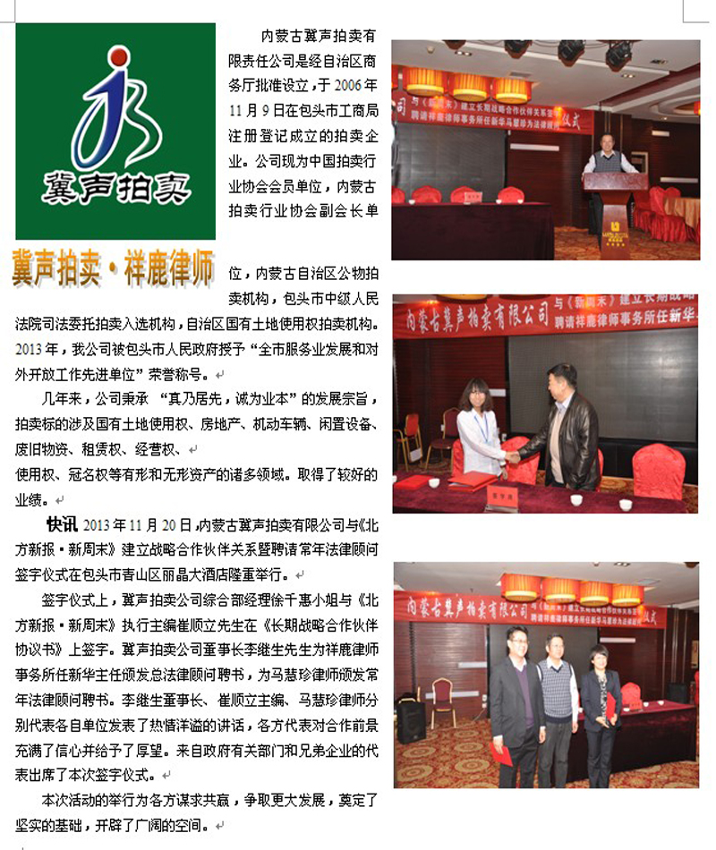 内蒙古冀声拍卖有限公司与《北方新报·新周末》建立战略合作伙伴关系